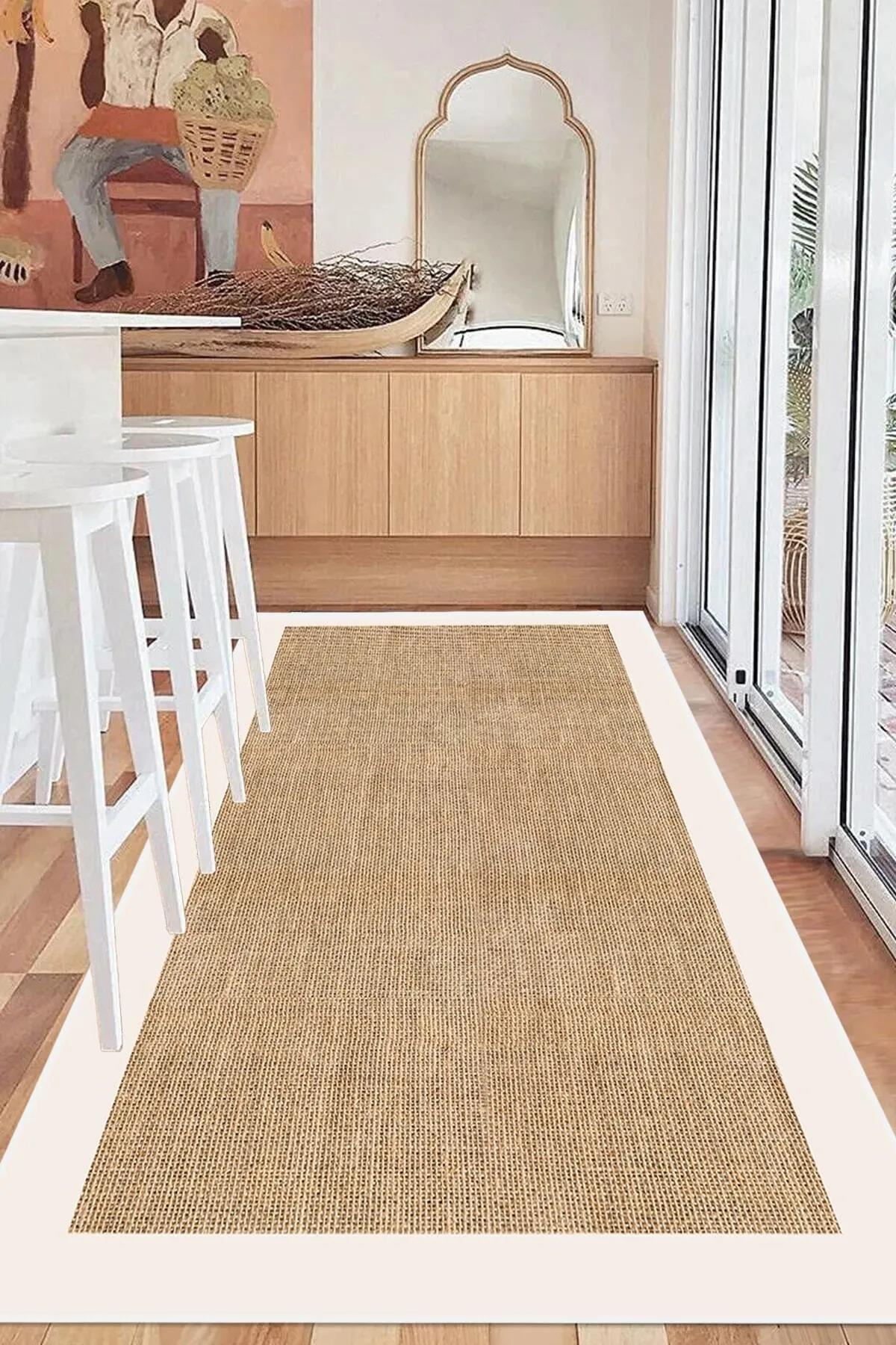 Dijital Kaymaz Yıkanabilir Jüt Görünümlü Beyaz Çerçeveli Salon Halısı Mutfak Halısı Yolluk DC-7024