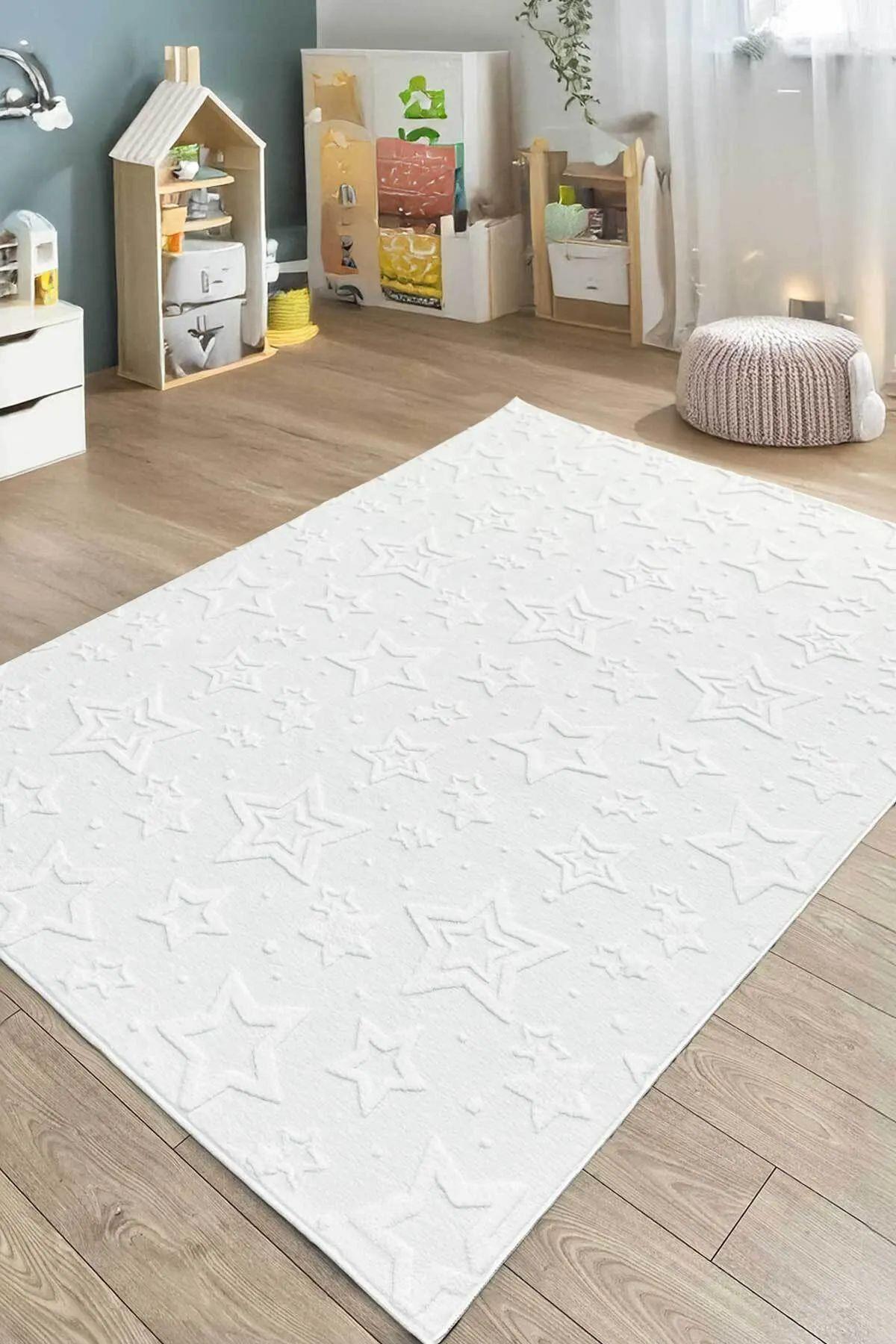 Stary BEYAZ Premium Puffy Peluş Kendinden Desenli Yıldızlı Kaymaz Taban Çocuk Halısı Oyun Halısı (CLR-STARY-BEYAZ)