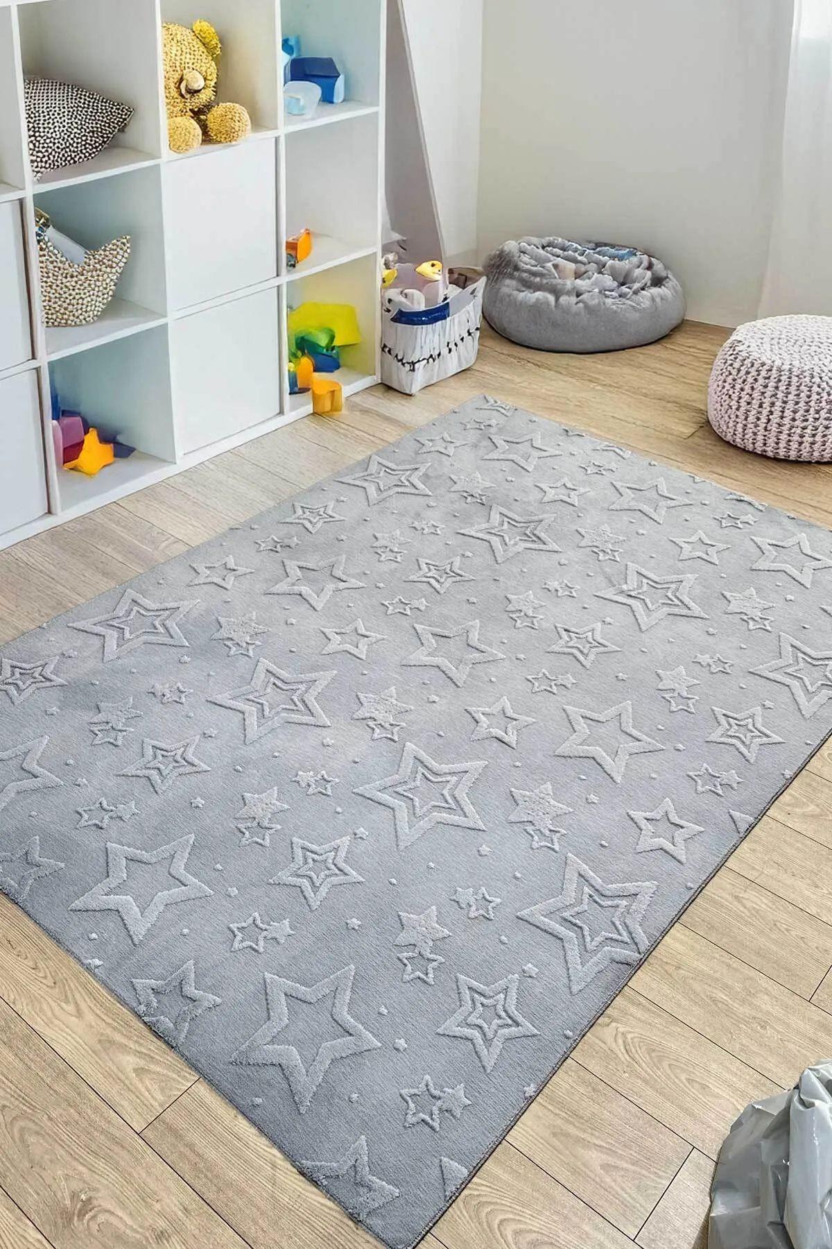 Stary GRİ Premium Puffy Peluş Kendinden Desenli Yıldızlı Kaymaz Taban Çocuk Halısı Oyun Halısı (CLR-STARY-GRİ)