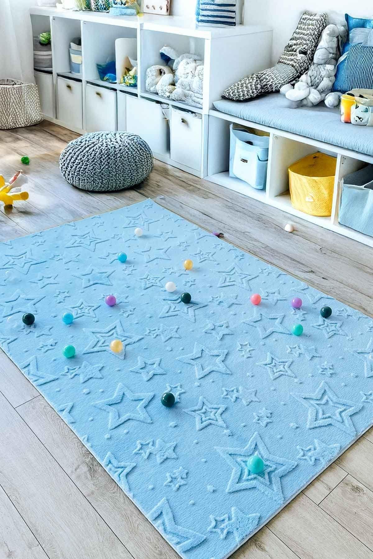 Stary MAVİ Premium Puffy Peluş Kendinden Desenli Yıldızlı Kaymaz Taban Çocuk Halısı Oyun Halısı (CLR-STARY-MAVİ)